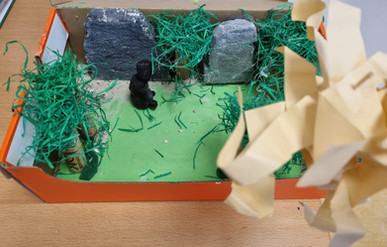 Danach haben wir in einem Schuhkarton diese Lebenswelten mit alten Verpackungsmaterial, wie Styropor, Pappen, Korken und einigen Zusatzmaterialien, wie Ostergras, Vogelsand und Farben, nachgestellt.